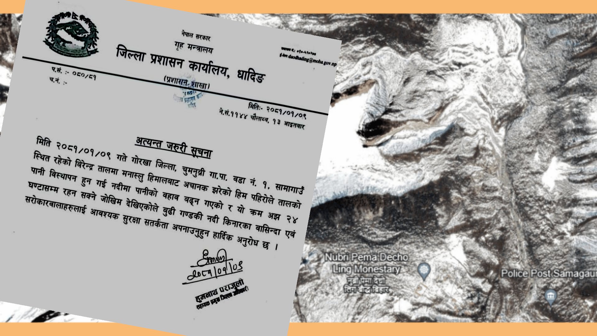 उत्तरी गाेरखाकाे चुमनुब्री गाउपालिका वडा नं १ सामागाउमा रहेकाे बिरेन्द्र तालमा मनासलु हिमालबाट अचानक झरेकाे हिम पहिराेकाे कारण तालकाे पानी विस्तापित भई बुढी गण्डकी नदिमा बाढि आउने खतरा देखिएकाे छ ।
