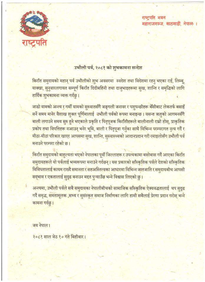 सम्माननीय राष्ट्रपति श्री रामचन्द्र पौडेलज्यूले उभौली पर्वको पावन अवसरमा दिनुभएको शुभकामना सन्देश