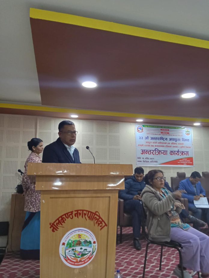 नीलकण्ठ नगरपालिकाको अपाङ्गता समन्वय समितिद्वारा आयोजित ३३ औ अन्तर्राष्ट्रिय अपाङ्गता दिवस “Amplifying the leadership of persons with disabilities for an inclusive and sustainable future” “समावेशी तथा दिगो भविष्यको पूर्वाधार, अपाङ्गता भएका व्यक्तिहरुको प्रबल नेतृत्व यसको आधार” भन्ने मुलनाराका साथ नगरपालिकाका नगर प्रमुख भिम प्रसाद ढुङ्गानाको प्रमुख आतिथ्यतामा आज सम्पन्न भएको हो।