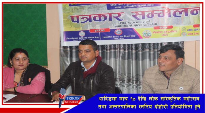 ‘लोक संस्कृतिको प्रर्वद्धनको सारः पहिचान पर्यटन र समृद्धिको आधार’ भन्ने नाराका साथ धादिङको मौलिक कला–संस्कृतिको प्रवर्धन मार्फत जिल्लाको पहिचान, पर्यटन र समृद्धिको आधार तयार गर्ने उद्देश्यले धादिङबेसी स्थित खुलामञ्चमा हुने मुल आयोजक समितिले पत्रकार सम्मेलन गर्दै जानकारी दिएको हो ।
