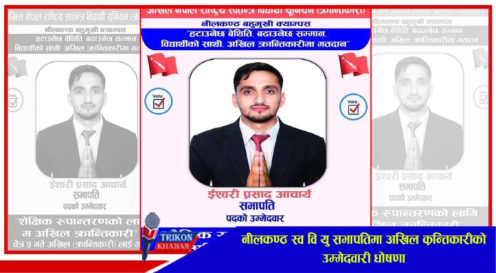 धादिङ । धादिङको निलकण्ठ नगर पालिका-३ मा रहेको निलकण्ठ बहुमुखि क्याम्पसमा नेकपा माओवादी केन्द्र निकट अखिल नेपाल राष्ट्रिय स्वतन्त्र विध्यार्थी युनियन क्रान्तिकारि संघठनको तर्फबाट ईश्वरि प्रसाद आचार्यले सभापति पदमा आफ्नो उम्मेदवारी दिने घोषणा गरेका छन । सम्पुर्ण निलकण्ठ बहुमुखी क्याम्पसमा अध्यनरत विध्यार्थीहरुलाइ नयाँ नेतृत्व चयन गर्न अग्रह समेत गरेका छन ।