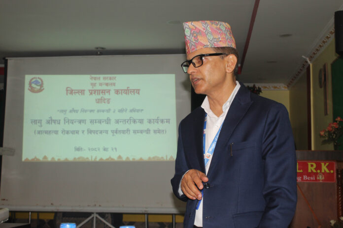 धादिङबेसी, धादिङ –जिल्ला प्रशासन कार्यालय धादिङको आयोजनामा बुधबार धादिङबेसीमा लागुऔषध नियन्त्रण, आत्महत्या रोकथाम तथा विपद् जन्य पूर्वतयारीसम्बन्धी अन्तरक्रिया कार्यक्रम सम्पन्न भएको छ। कार्यक्रम धादिङका प्रमुख जिल्ला अधिकारी सुमन घिमिरेको संयोजकत्वमा सम्पन्न भएको हो।