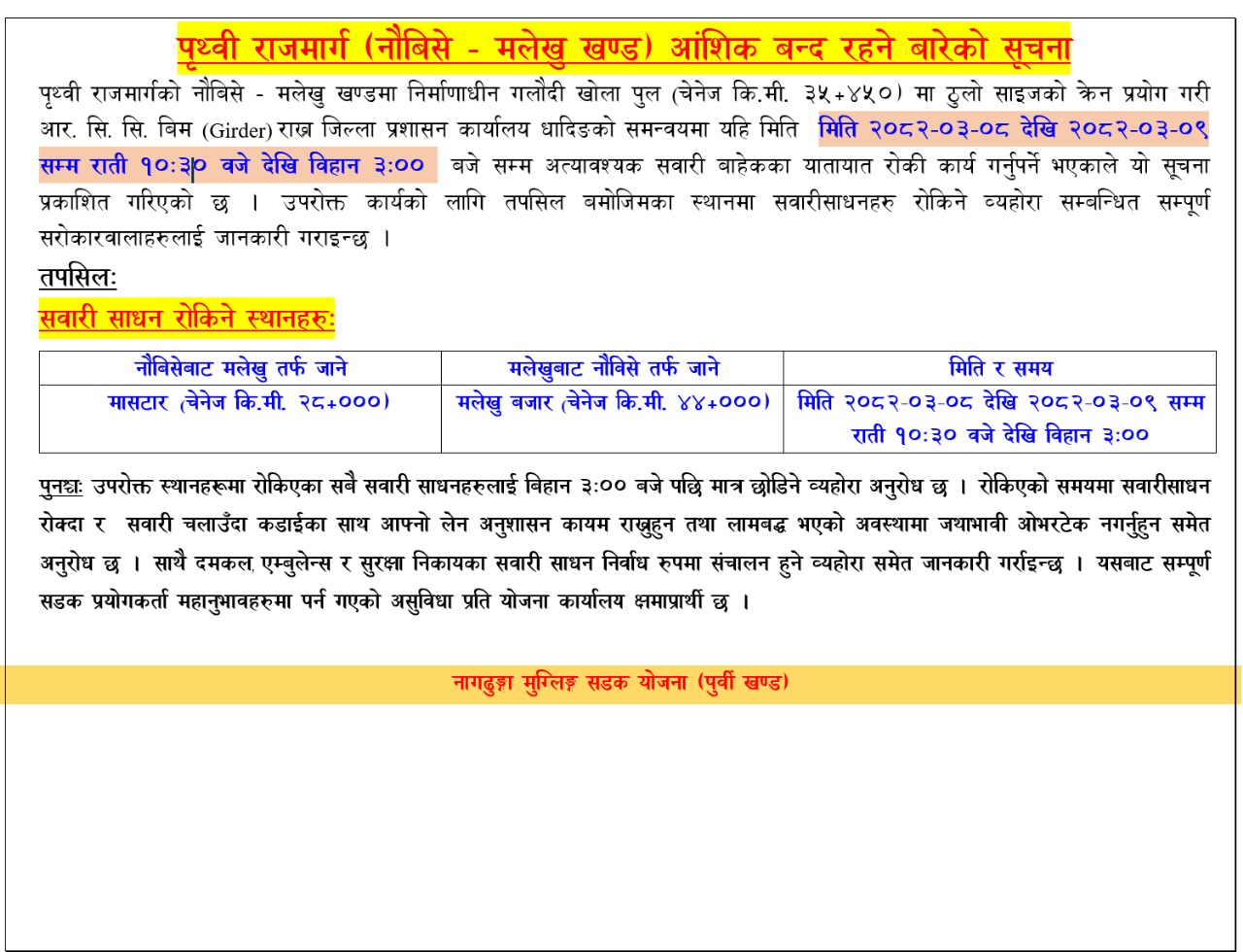 पृथ्वी राजमार्गअन्तर्गत नौबिसे–मलेखु सडक खण्ड दुई दिनका लागि रातिको समयमा बन्द हुने भएको छ।