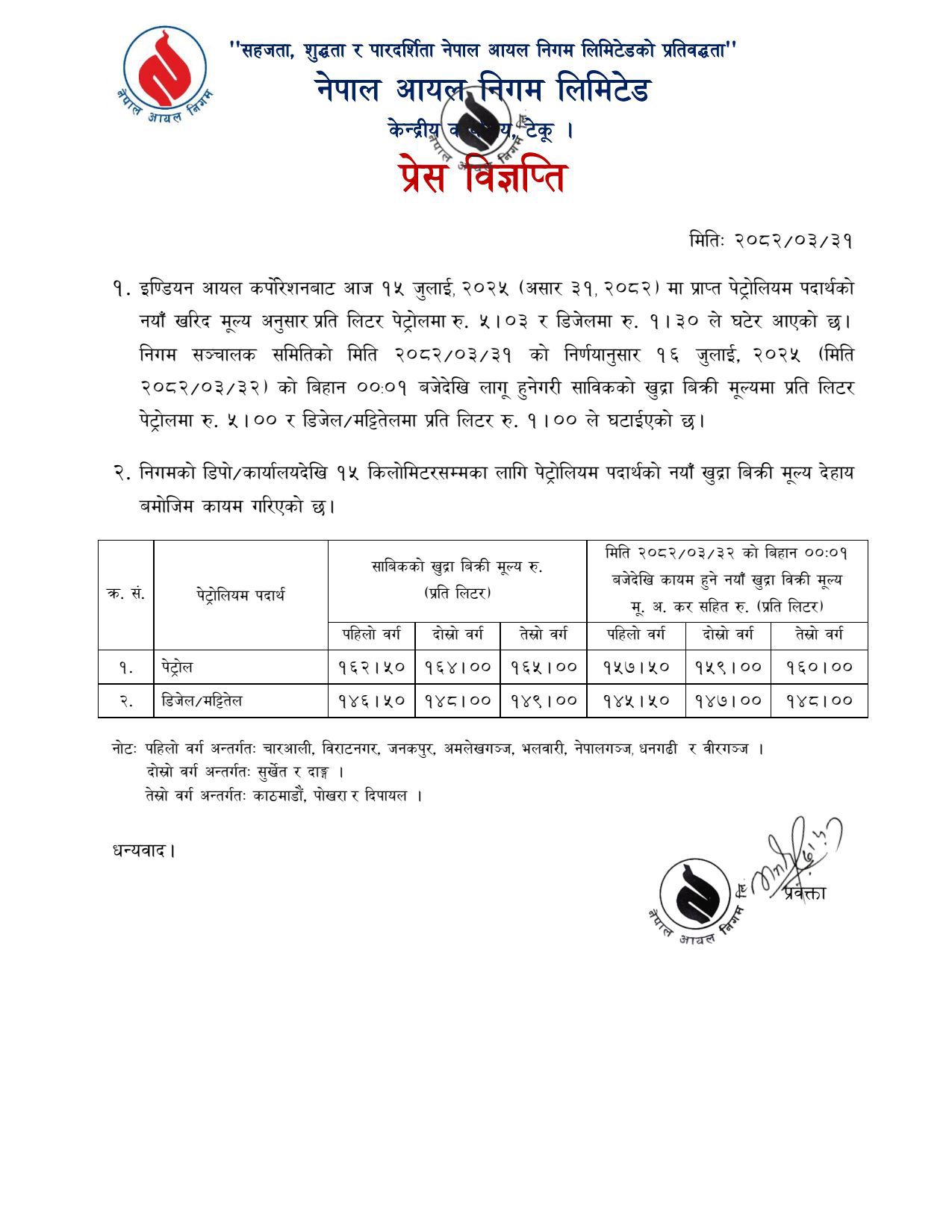 नयाँ मूल्यअनुसार पेट्रोलमा प्रतिलिटर ५ रुपैयाँ र डिजेल/मट्टितेलमा प्रतिलिटर १ रुपैयाँले मूल्य घटाइएको निगमले जनाएको छ। नयाँ मूल्य २०८२ असार ३२ गते राति १२:०१ बजेदेखि लागू हुने गरी निर्धारण गरिएको छ।