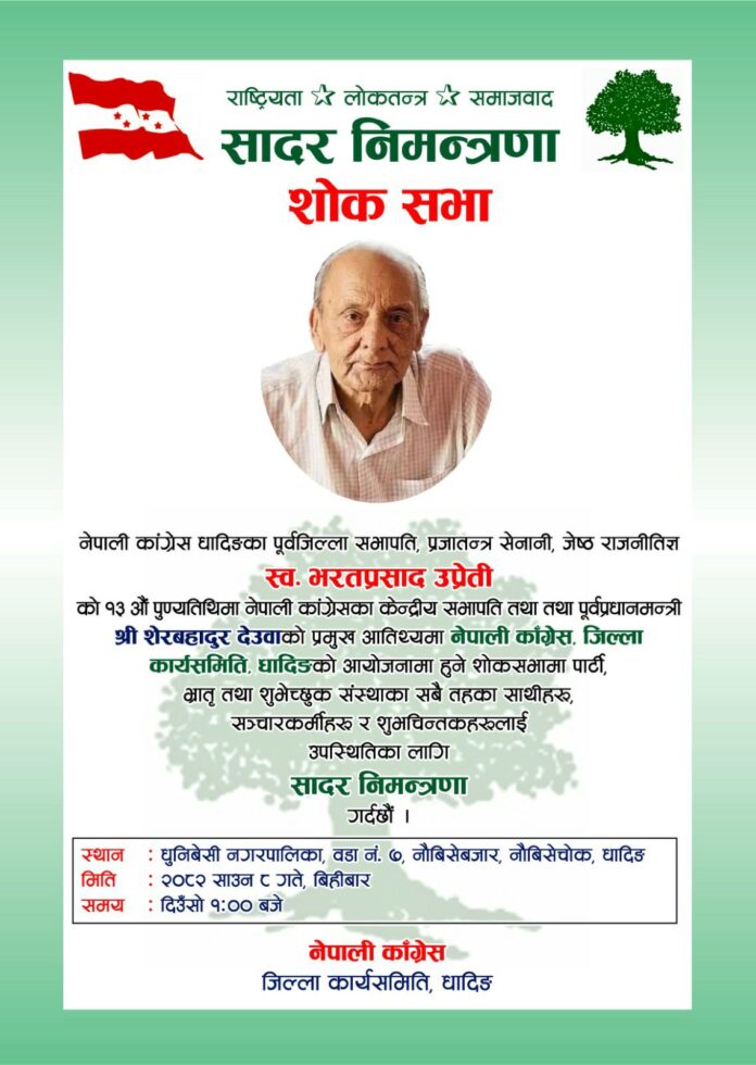 धादिङ – नेपाली कांग्रेस धादिङका पूर्वजिल्ला सभापति तथा प्रजातान्त्रिक आन्दोलनका अथक योद्धा स्वर्गीय भरत प्रसाद उप्रेतीको १३औं दिनको पुण्यतिथिको अवसरमा श्रद्धाञ्जली सभा आयोजना गरिने भएको छ।