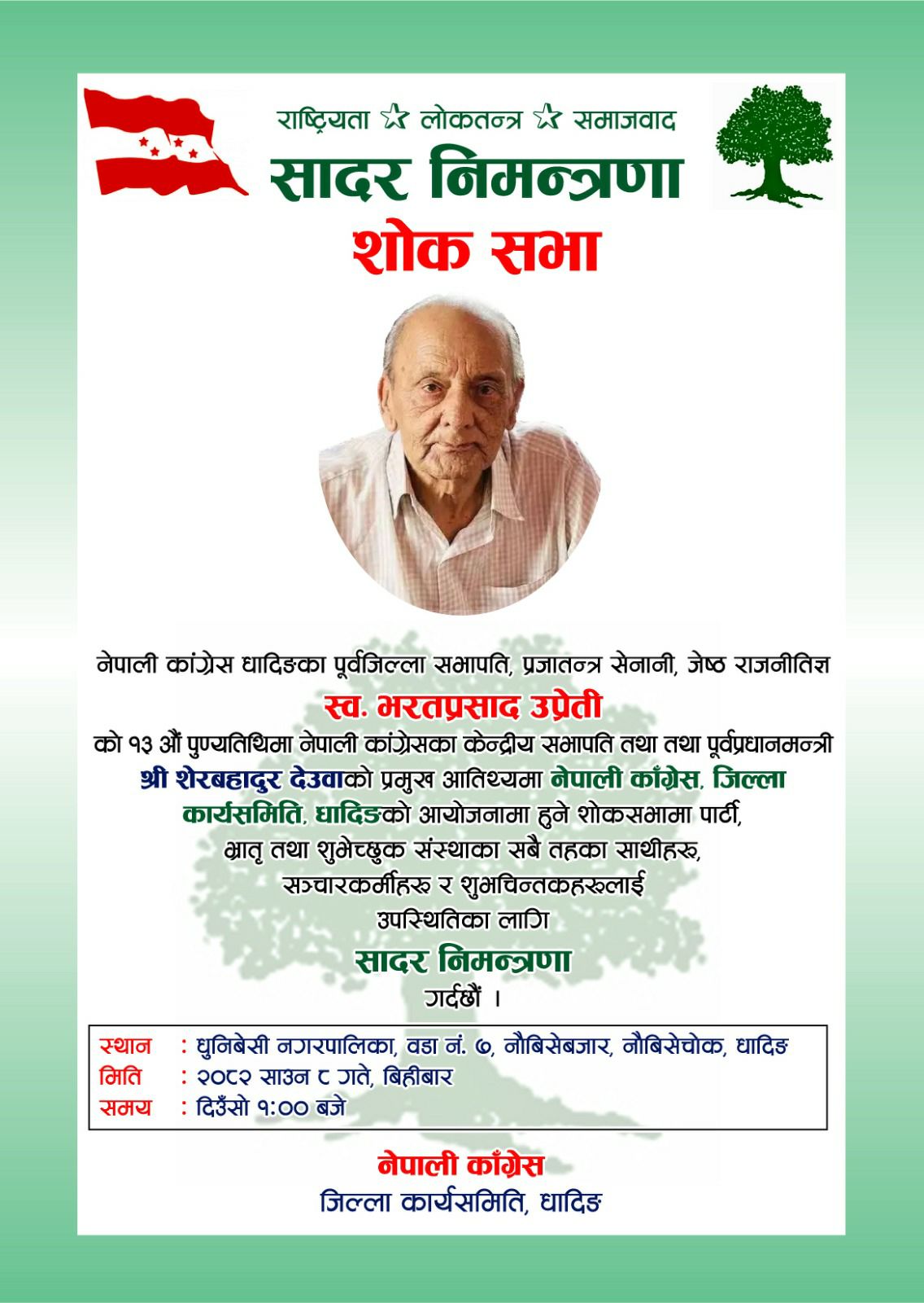 नेपाली कांग्रेस जिल्ला कार्यसमिति धादिङको आयोजनामा साउन ८ गते, बिहीबार दिउँसो १ बजे धुनिबेसी नगरपालिका–७ स्थित नौबिसेचोकमा उक्त श्रद्धाञ्जली सभा सम्पन्न हुने कार्यक्रम तय गरिएको छ। कार्यक्रममा नेपाली कांग्रेसका केन्द्रीय सभापति एवं पूर्वप्रधानमन्त्री शेरबहादुर देउवाको पनि विशेष उपस्थिति रहने बताइएको छ।