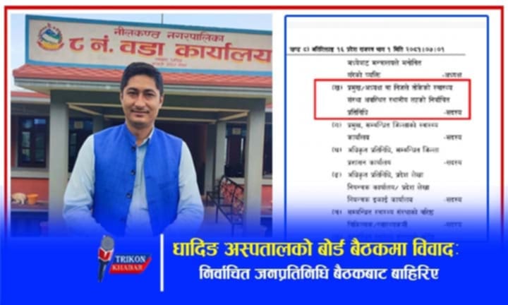 धादिङ अस्पतालको आज बसेको बोर्ड बैठक विवादित बनेको छ। बैठकमा स्वास्थ्य संस्था रहेको स्थानीय पालिकाबाट प्रतिनिधित्व गर्दै आएका निर्वाचित जनप्रतिनिधि नीलकण्ठ नगरपालिका वडा नं ८ का अध्यक्ष तथा प्रवक्ता प्रकाश कुमार श्रेष्ठलाई धादिङ अस्पतालका अध्यक्ष राधिका सापकोटाले “अधिकारिक सदस्य होइन” भन्ने अभिव्यक्तिपछि बैठक बहिष्कार गरी बाहिरिएको अध्यक्ष श्रेष्ठले त्रिकोण खवरलाई जानकारी दिए।