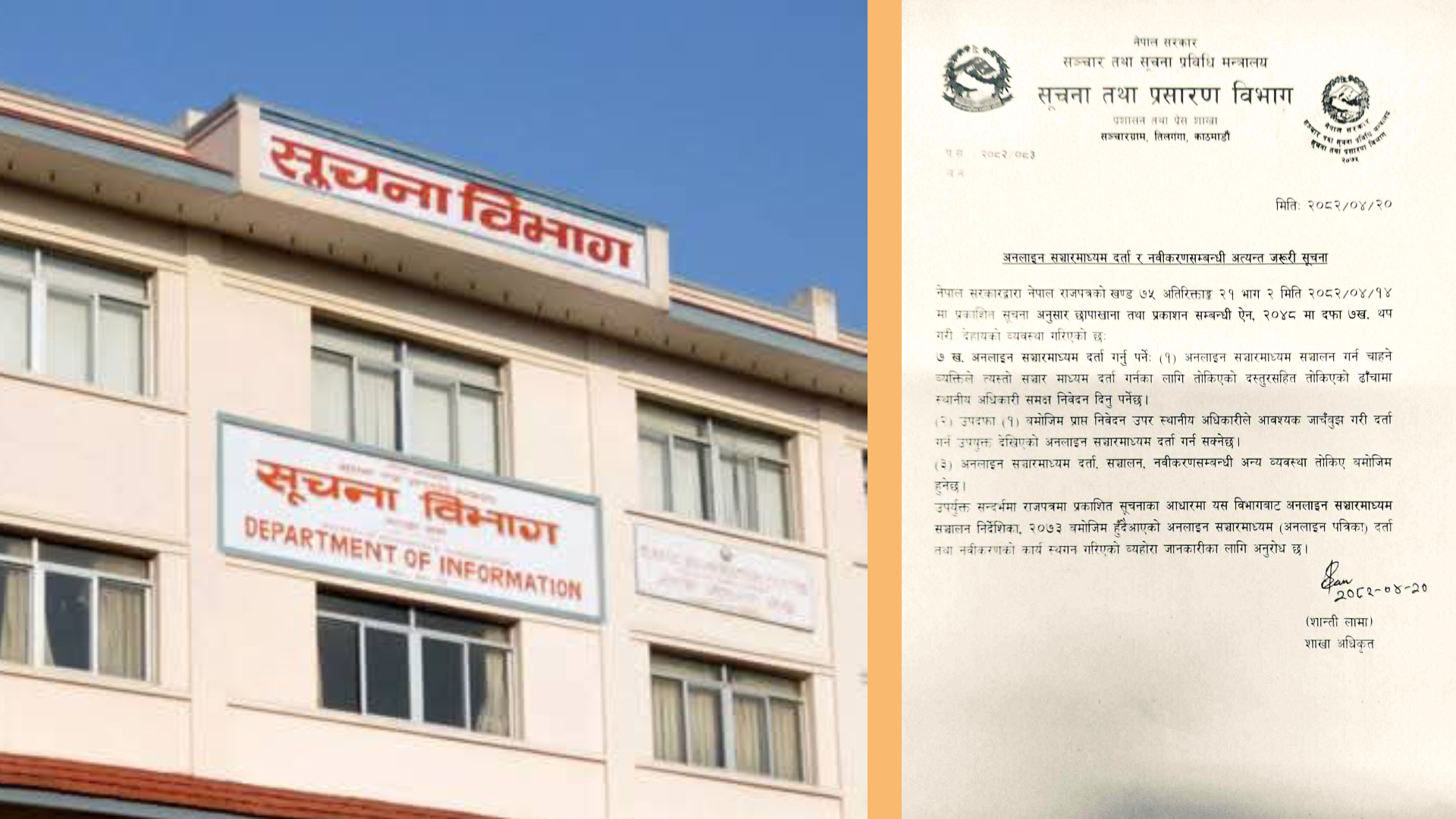 विभागले सोमबार सूचना जारी गर्दै छापाखाना तथा प्रकाशन सम्बन्धी ऐन, २०४८ मा हालै सरकारले गरेको संशोधनअनुसार अब अनलाइन सञ्चारमाध्यम जिल्ला प्रशासन कार्यालयबाट दर्ता हुने व्यवस्था लागू भएको जानकारी दिएको हो।