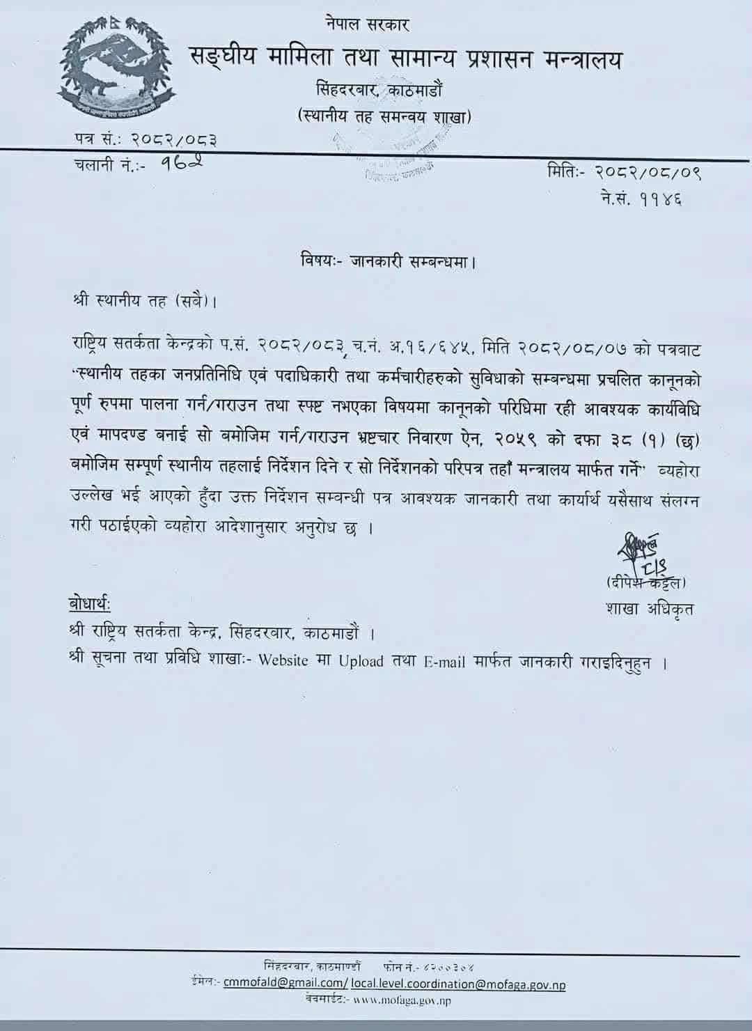 उजुरीहरूका आधारमा केन्द्रले संघीय मामिला तथा सामान्य प्रशासन मन्त्रालयमार्फत देशभरका स्थानीय तहलाई तत्काल ध्यानाकर्षण गराएको छ। सरकारी स्वामित्वका सवारी र संसाधनहरू व्यक्तिगत स्वार्थमा प्रयोग गर्नु कानुनतः निषेधित रहेको याद गराउँदै केन्द्रले दुरुपयोग रोकिने गरी आवश्यक अनुगमन, कारबाही र सुधारात्मक कदम चाल्न स्थानीय तहहरूलाई निर्देशन दिएको हो।