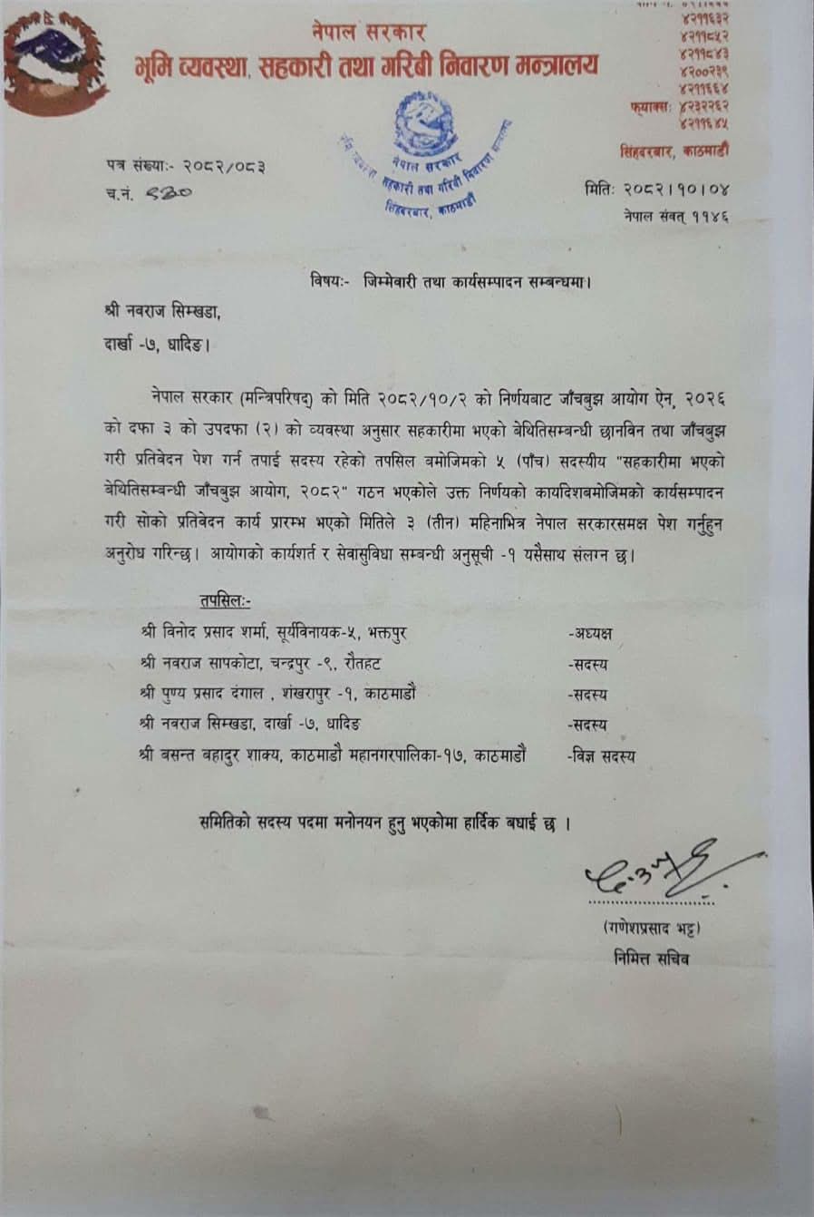 नेपाल सरकार भूमि व्यवस्था, सहकारी तथा गरिबी निवारण मन्त्रालयले सहकारीमा भएका बेथितिबारे छानबिन गर्न गठन गरिएको सहकारीमा भएको बेथितिसम्बन्धी छानबिन आयोग मा नवराज सिम्खडालाई सदस्यमा मनोनयन गरेको छ।