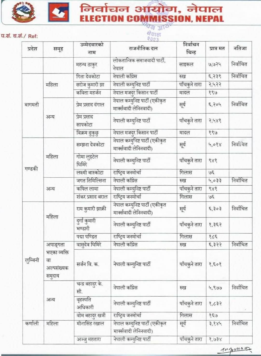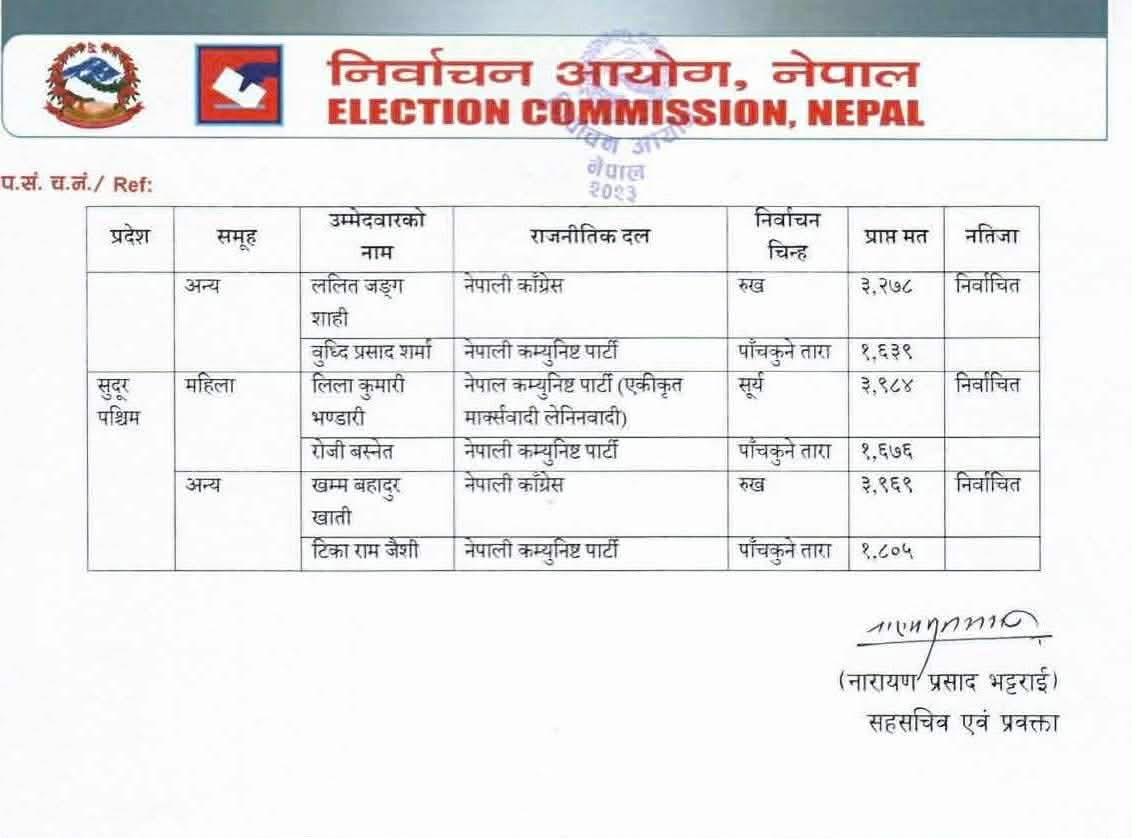 निर्वाचन कार्यालयका अनुसार आज सम्पन्न निर्वाचन शान्तिपूर्ण रूपमा सम्पन्न भएको थियो । प्रदेश सभा सदस्य तथा स्थानीय तहका प्रमुख–उपप्रमुखहरूको सहभागितामा सम्पन्न यस निर्वाचनको औपचारिक नतिजा सम्बन्धित निकायमार्फत सार्वजनिक गरिएको हो ।