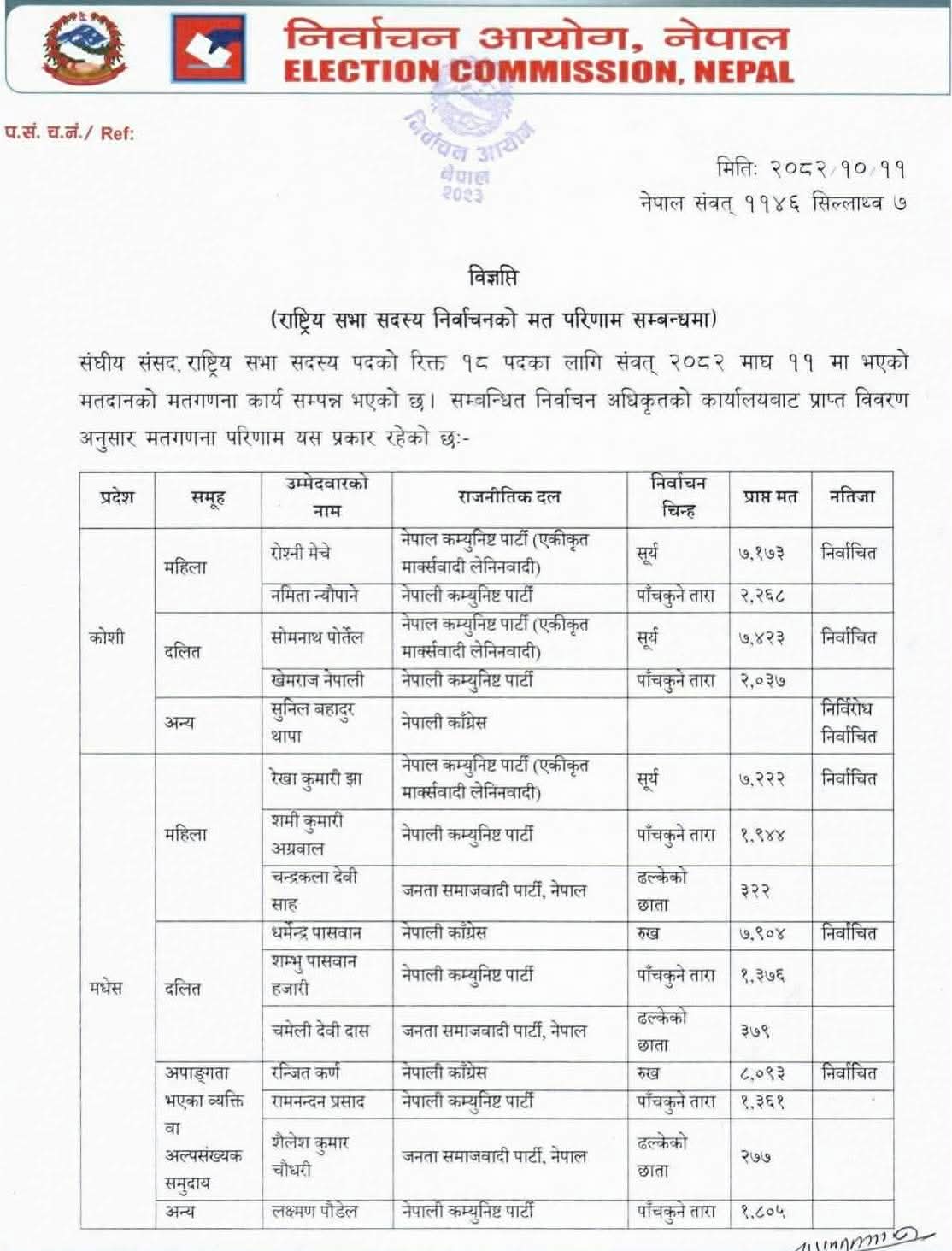 निर्वाचन कार्यालयले सार्वजनिक गरेको विवरण अनुसार राष्ट्रिय सभा सदस्य निर्वाचनबाट विभिन्न राजनीतिक दलका उम्मेदवारहरू निर्वाचित भएका छन् । सार्वजनिक नतिजा अनुसार नेकपा (एमाले), नेपाली कांग्रेस तथा जनता समाजवादी पार्टीका उम्मेदवारहरू विजयी भएका छन ,  (एमाले) – चुनाव चिन्ह : सूर्य