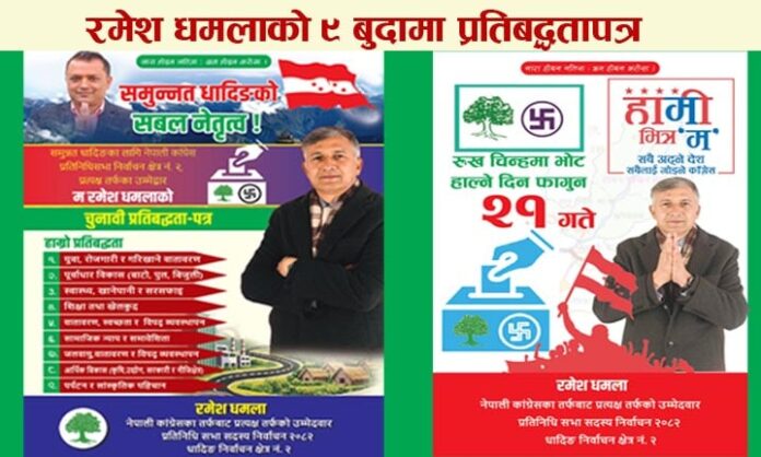 प्रतिनिधि सभा सदस्य निर्वाचन २०८२ लक्षित गर्दै धादिङ क्षेत्र नं. २ का लागि रमेश धमलाले ९ बुँदे चुनावी प्रतिबद्धता सार्वजनिक गरेका छन्। नेपाली कांग्रेसका तर्फबाट प्रत्यक्ष उम्मेदवार रहेका धमलाले गणतन्त्र र संघीय लोकतान्त्रिक व्यवस्थाको सुदृढीकरण, सामाजिक न्याय, समावेशिता र सुशासनमार्फत जनताको जीवनस्तर उकास्ने लक्ष्यसहित आफ्नो एजेन्डा अघि सारेका हुन्।