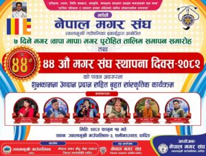 धादिङ। नेपाल मगर संघ ज्वालामुखी गाउँपालिका समिति को आयोजनामा ४४ औँ स्थापना दिवसको अवसरमा ज्वालामुखी–३ चक्रदेवी टोलमा फागुन १५ गते बृहत् सांस्कृतिक कार्यक्रम आयोजना गरिने भएको छ।