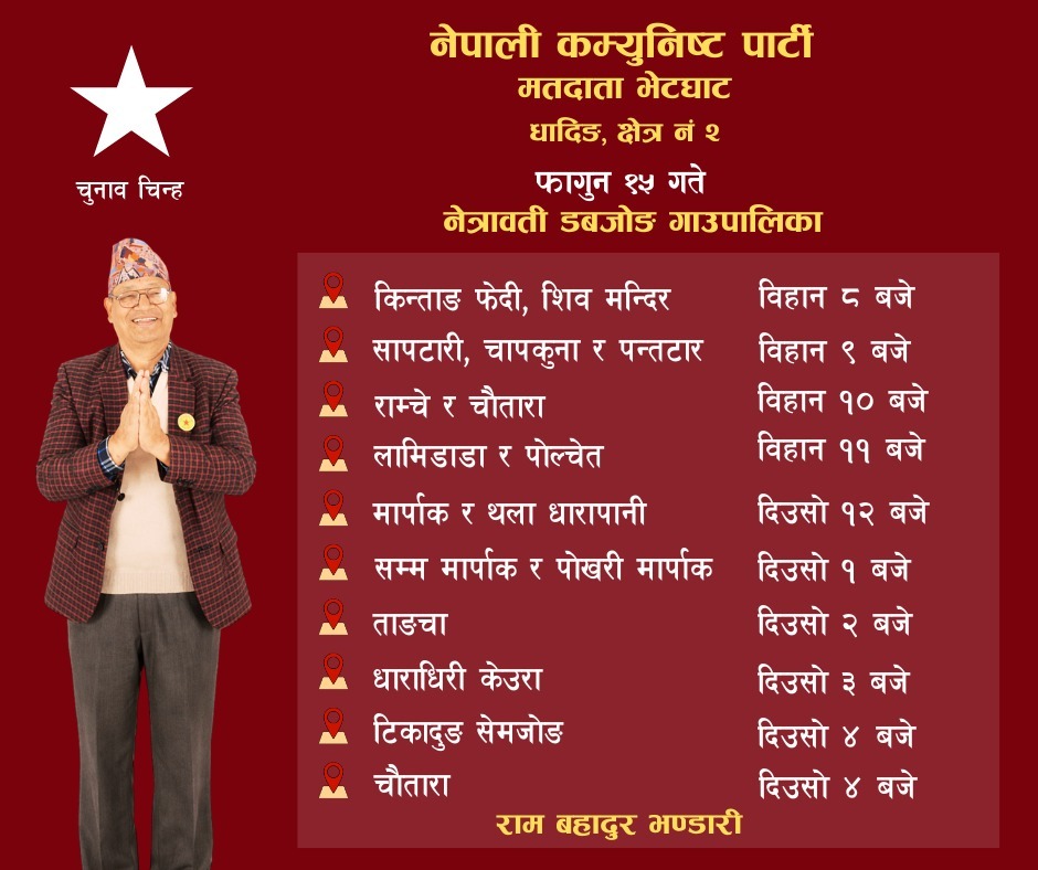 नेपाली कम्युनिस्ट पार्टी धादिङ क्षेत्र नम्बर २ का उम्मेदवार राम बहादुर भण्डारीले चुनावी भेटघाट तथा मतदाता संवाद कार्यक्रमलाई तीव्रता दिएका छन्।