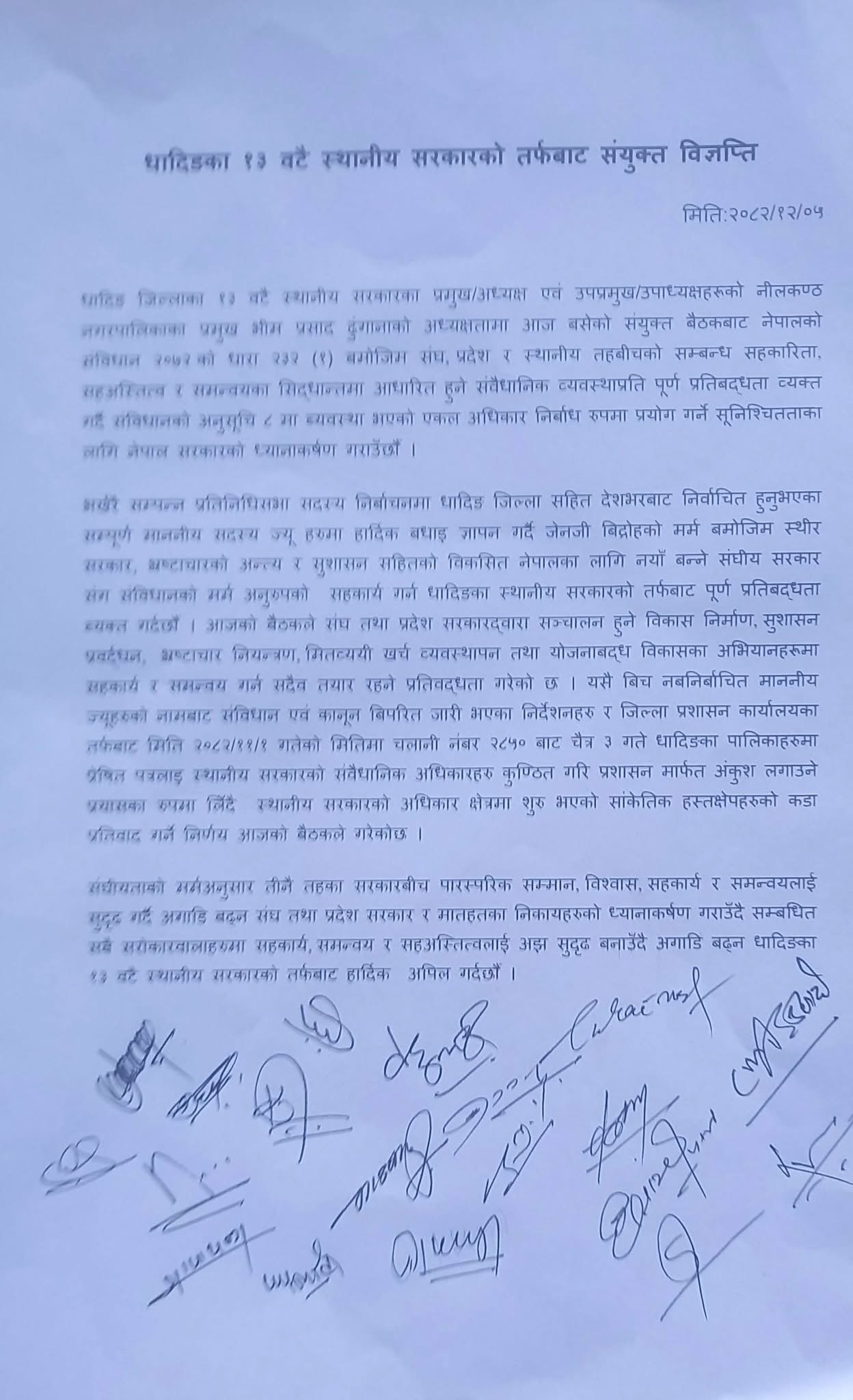 “संविधानले कसैलाई पनि कानुनभन्दा माथि रहने छुट दिएको छैन,” उहाँले भन्नुभयो, “समृद्ध धादिङ र सुशासन कायम गर्न सबै पक्ष एकजुट हुनुपर्छ।”