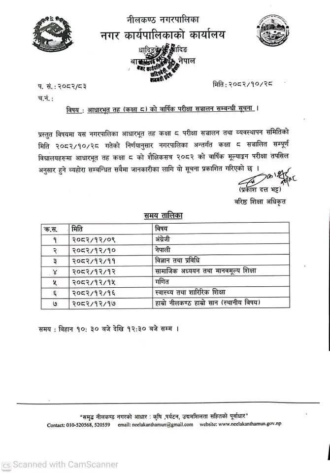 नीलकण्ठ न पा मा कक्षा ८ को परिक्षा शुरु हुने