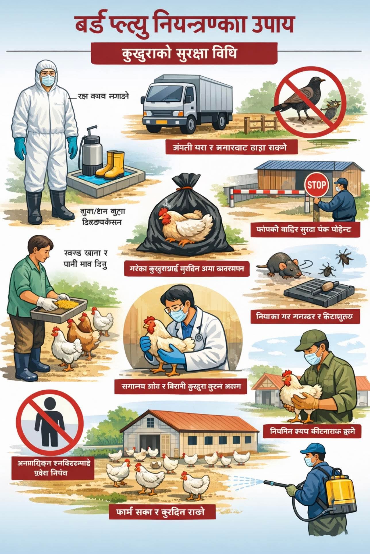 जिल्ला पशुसेवा कार्यालय धुलिखेलले काभ्रे र सिन्धुपाल्चोकमा बर्डफ्लु सङ्क्रमण भित्रन नदिन उच्च सतर्कता अपनाउने निर्णयसमेत गरेको छ । देशका केही स्थानमा पालिएका कुखुरामा बर्डफ्लु सङ्क्रमण देखिएपछि यी जिल्लामा पनि जोखिम हुनसक्ने सम्भावनालाई मध्यनजर गर्दै सुरक्षाका उपाय कडा पार्न लागिएको हो ।