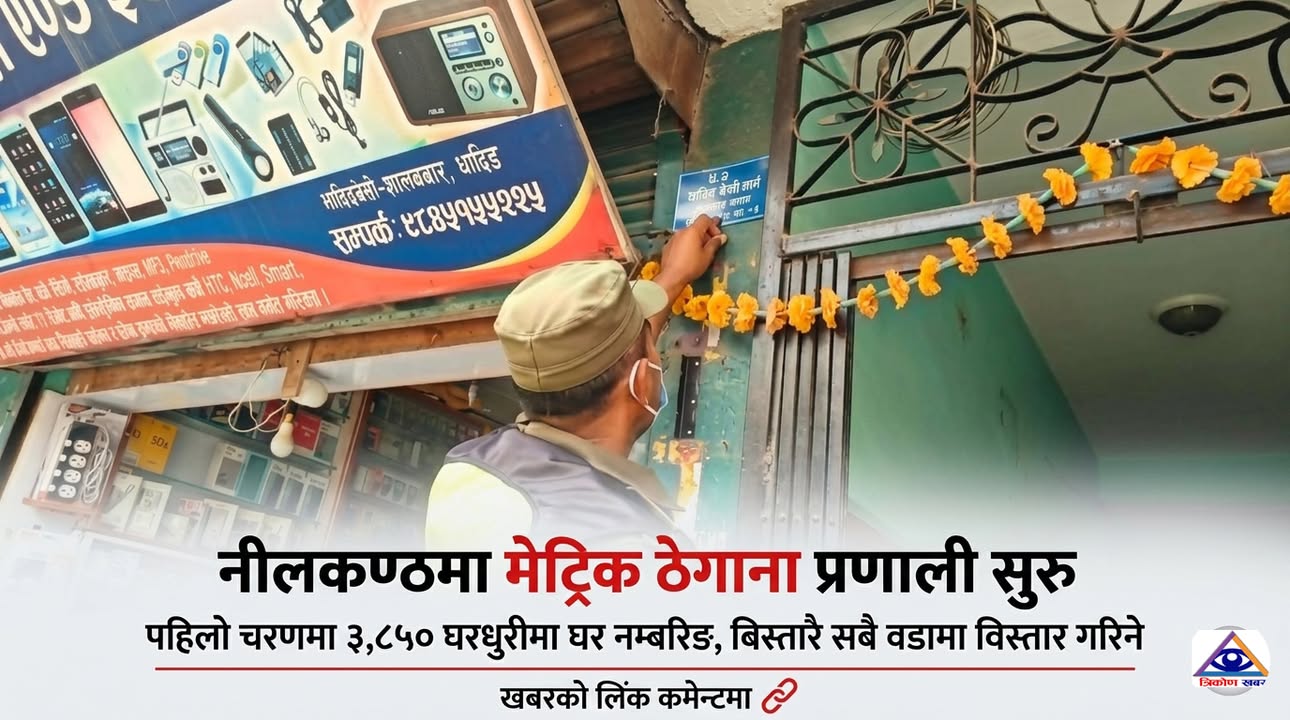 धादिङस्थित नीलकण्ठ नगरपालिकाले शहरी व्यवस्थापनलाई प्रभावकारी बनाउन मेट्रिक ठेगाना प्रणाली (मेट्रिक एड्रेसिङ सिस्टम) कार्यान्वयन सुरु गरेको छ। नगरभित्र रहेका १६ हजार ३ सय ९१ घरधुरीमध्ये पहिलो चरणमा ३ हजार ८ सय ५० घरधुरीमा हाउस नम्बरिङ तथा सडक सूचना बोर्ड जडान गर्ने काम अघि बढाइएको नगरपालिकाले जनाएको छ।